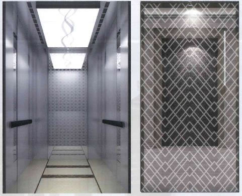 轎壁:后壁中間鏡面蝕刻兩側鏡面噴砂不銹鋼,側壁中間鏡面蝕刻兩側鏡面噴砂不銹鋼